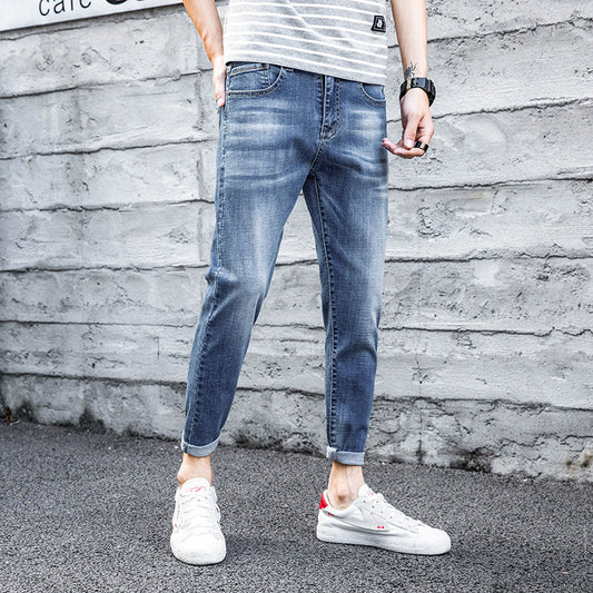 Washed Micro-elastic Frayed Cropped Jeans Men