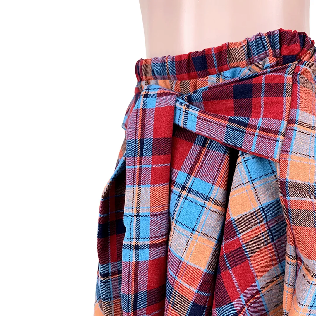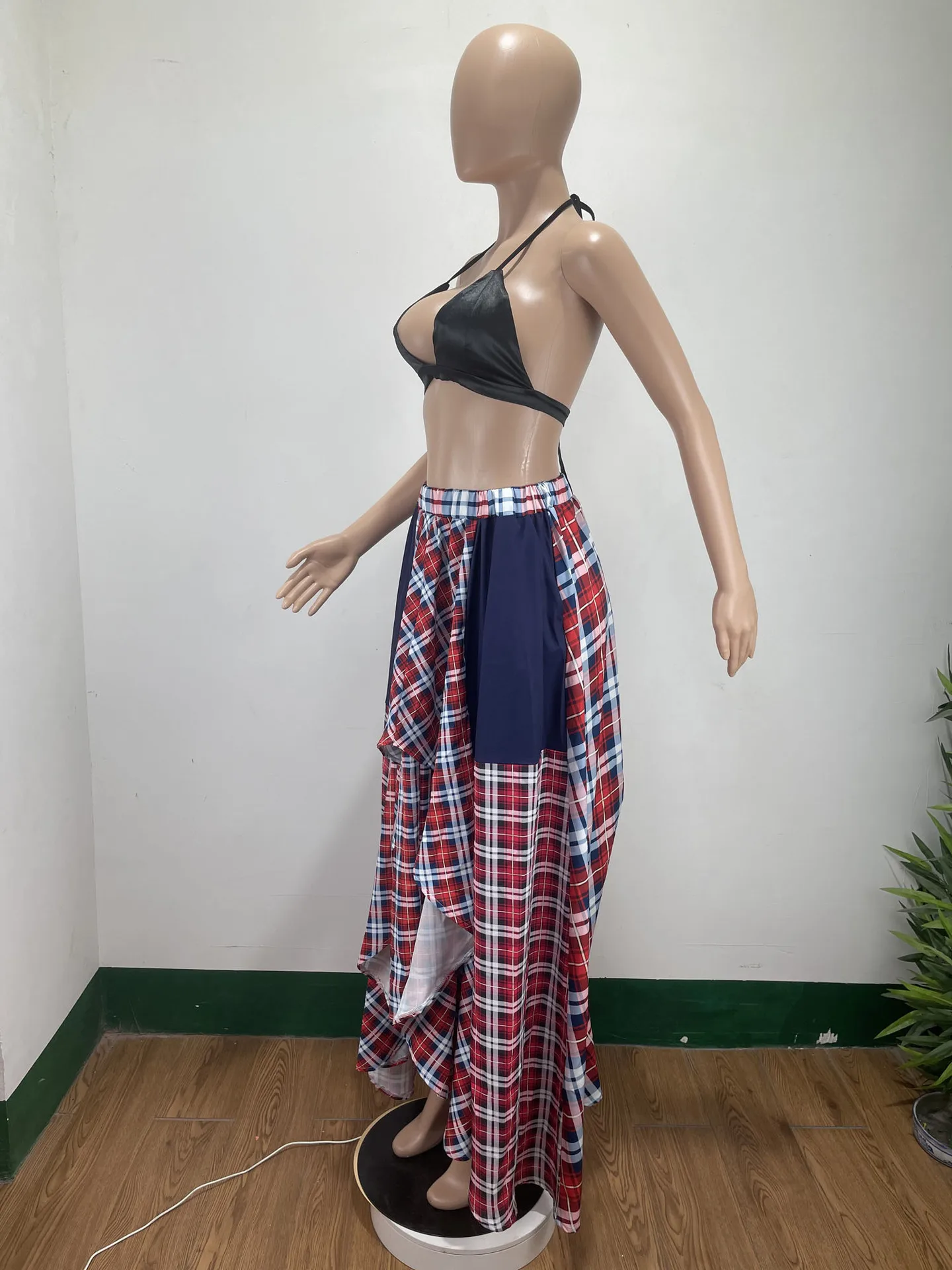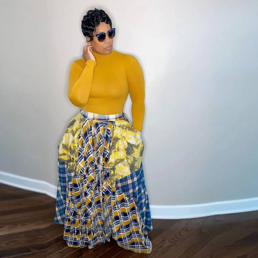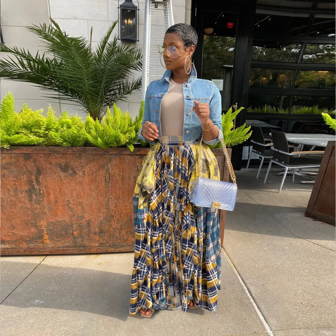 Plaid Checkered Tie Dye Patchwork Pleated Skirt Women Vintage High Waist Ruched Maxi Skirt Summer Female Floor Length Skirts