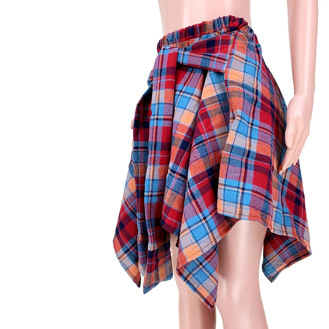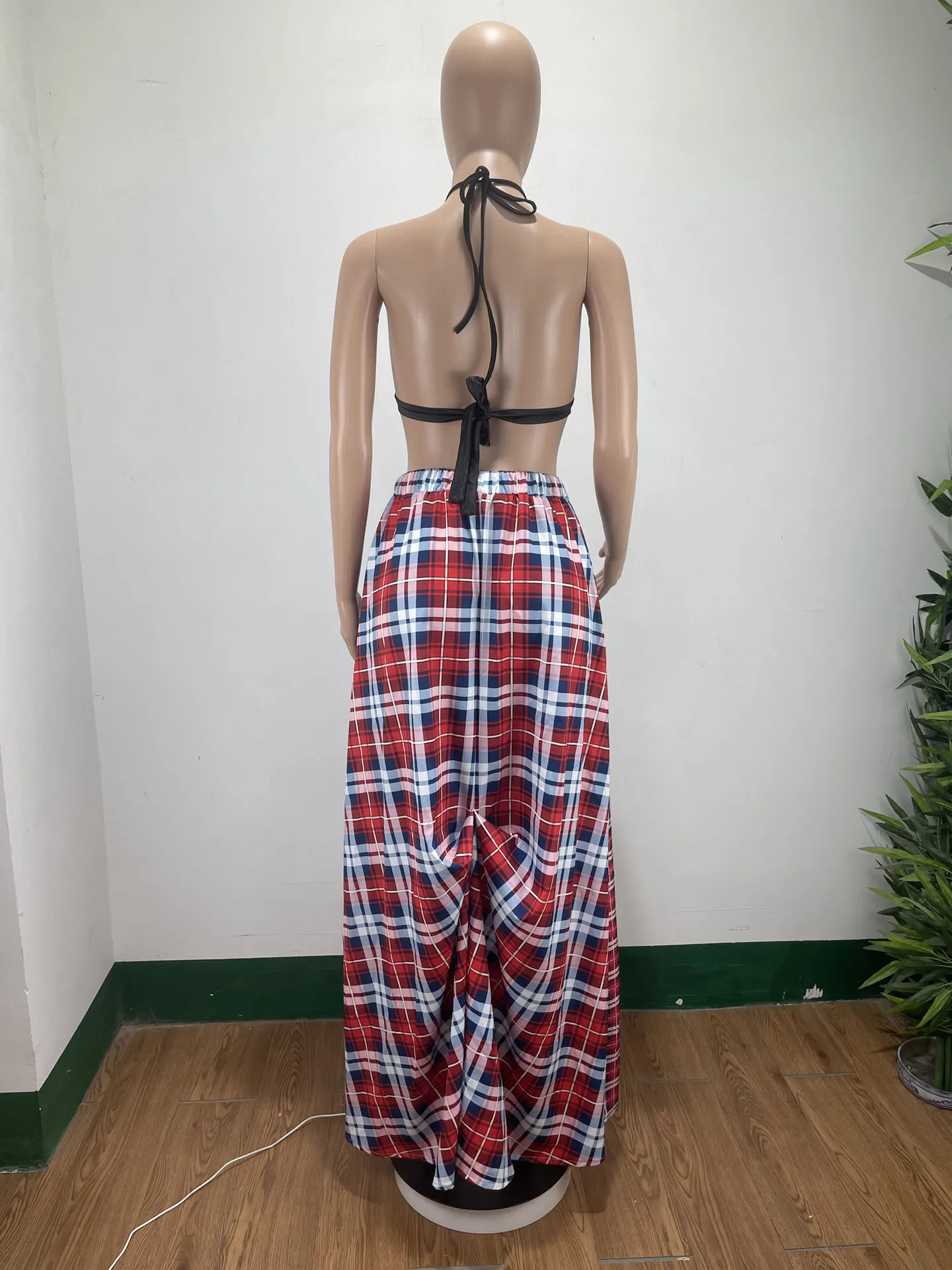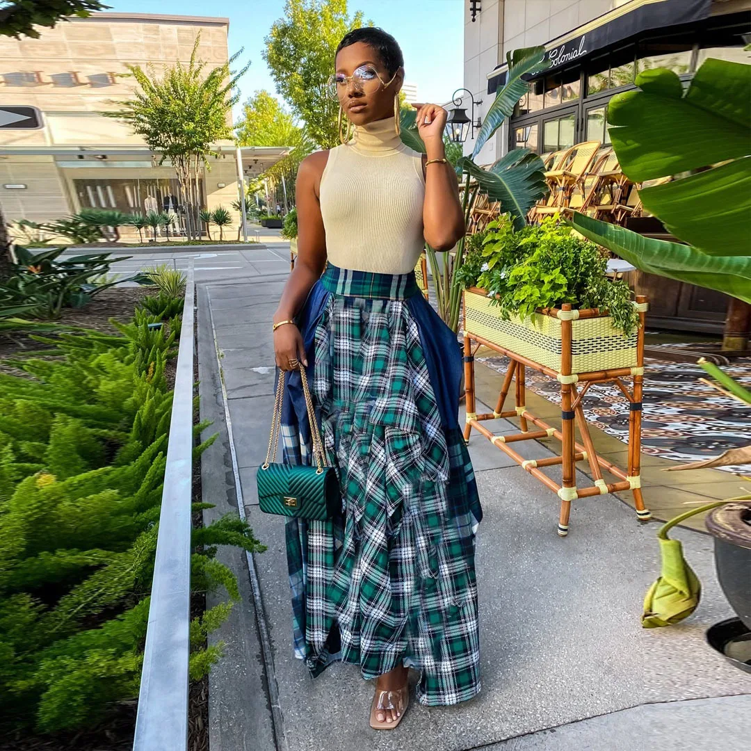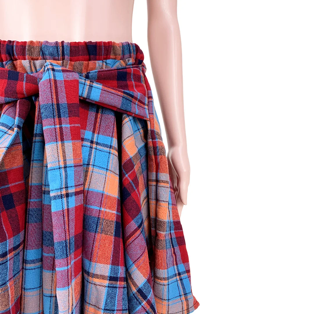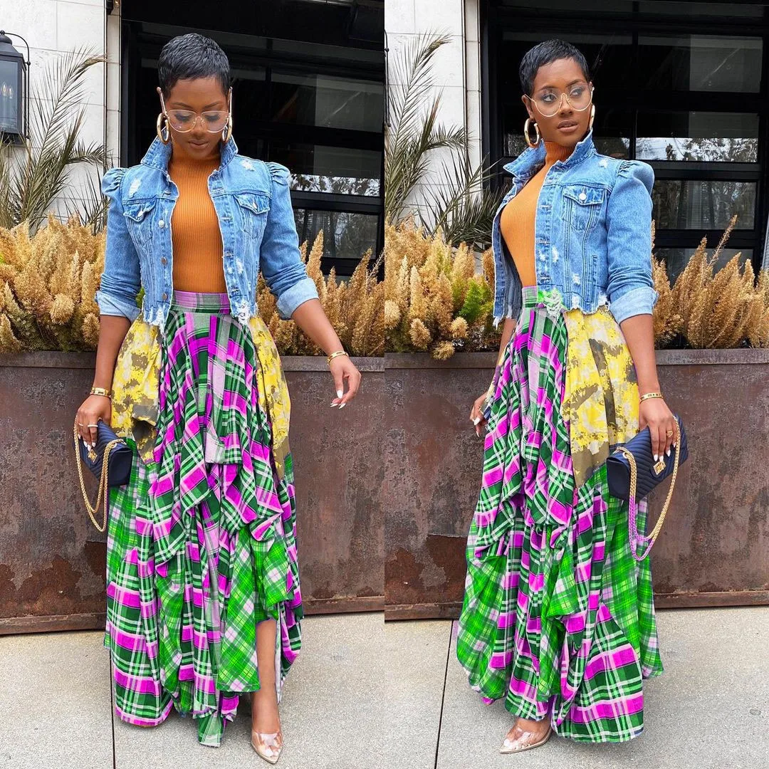 Plaid Checkered Tie Dye Patchwork Pleated Skirt Women Vintage High Waist Ruched Maxi Skirt Summer Female Floor Length Skirts