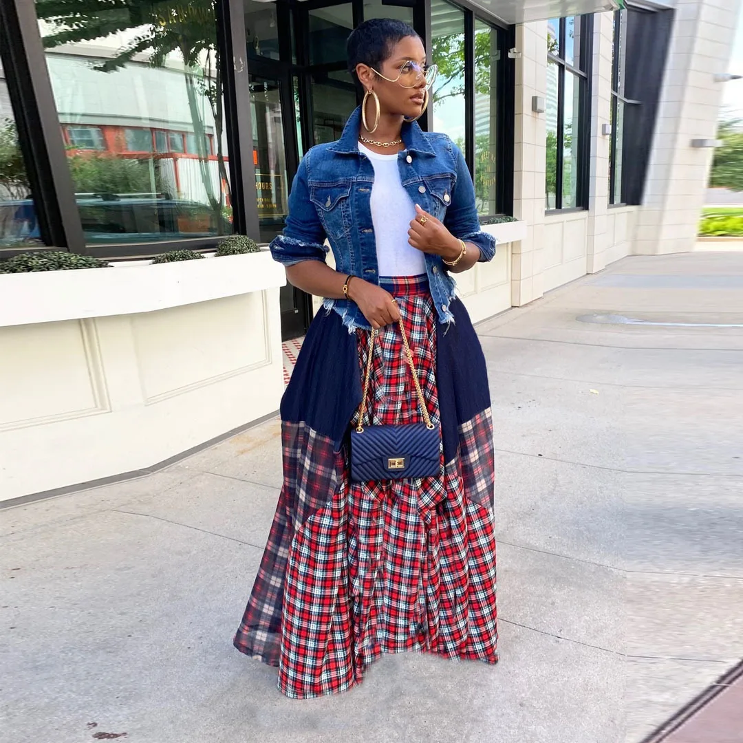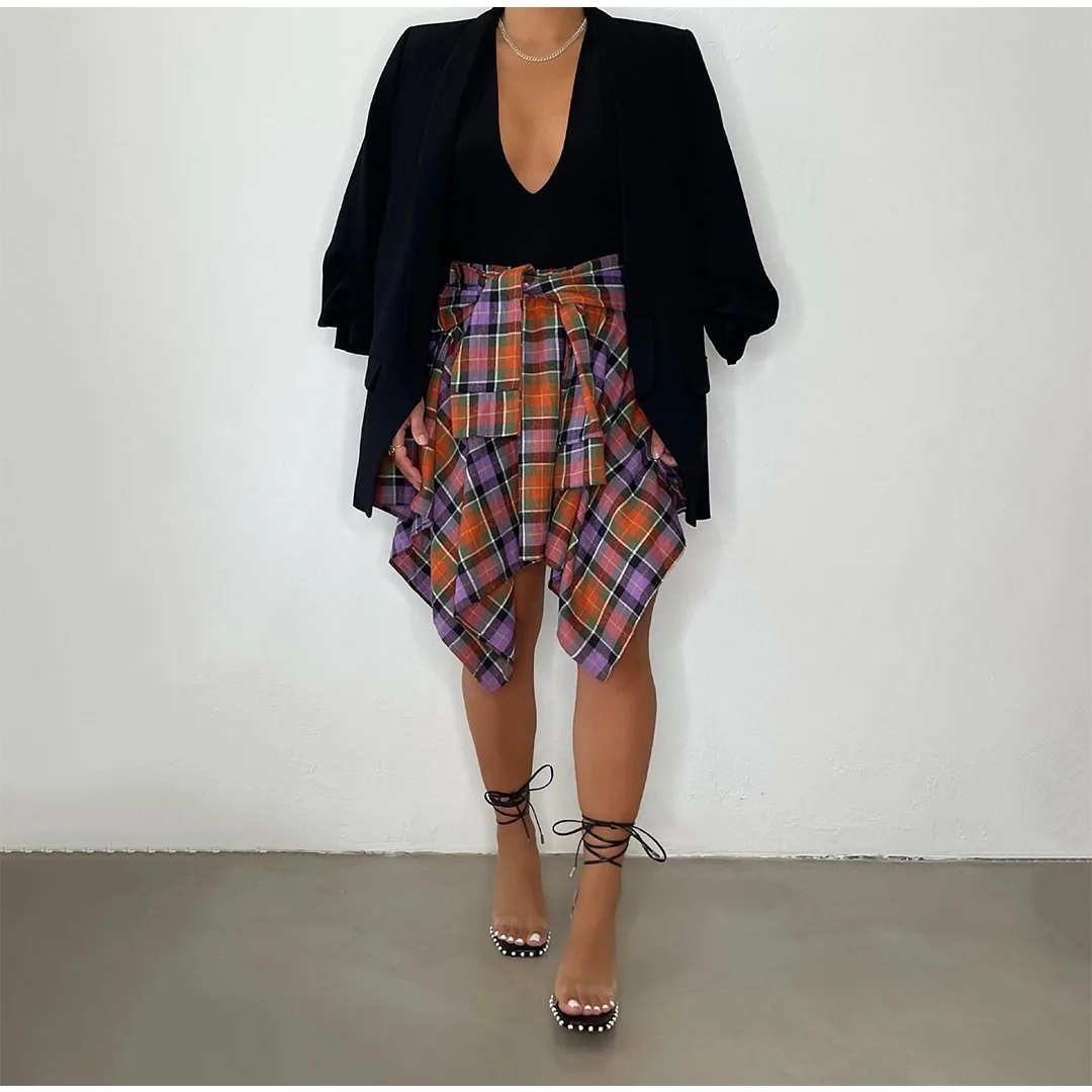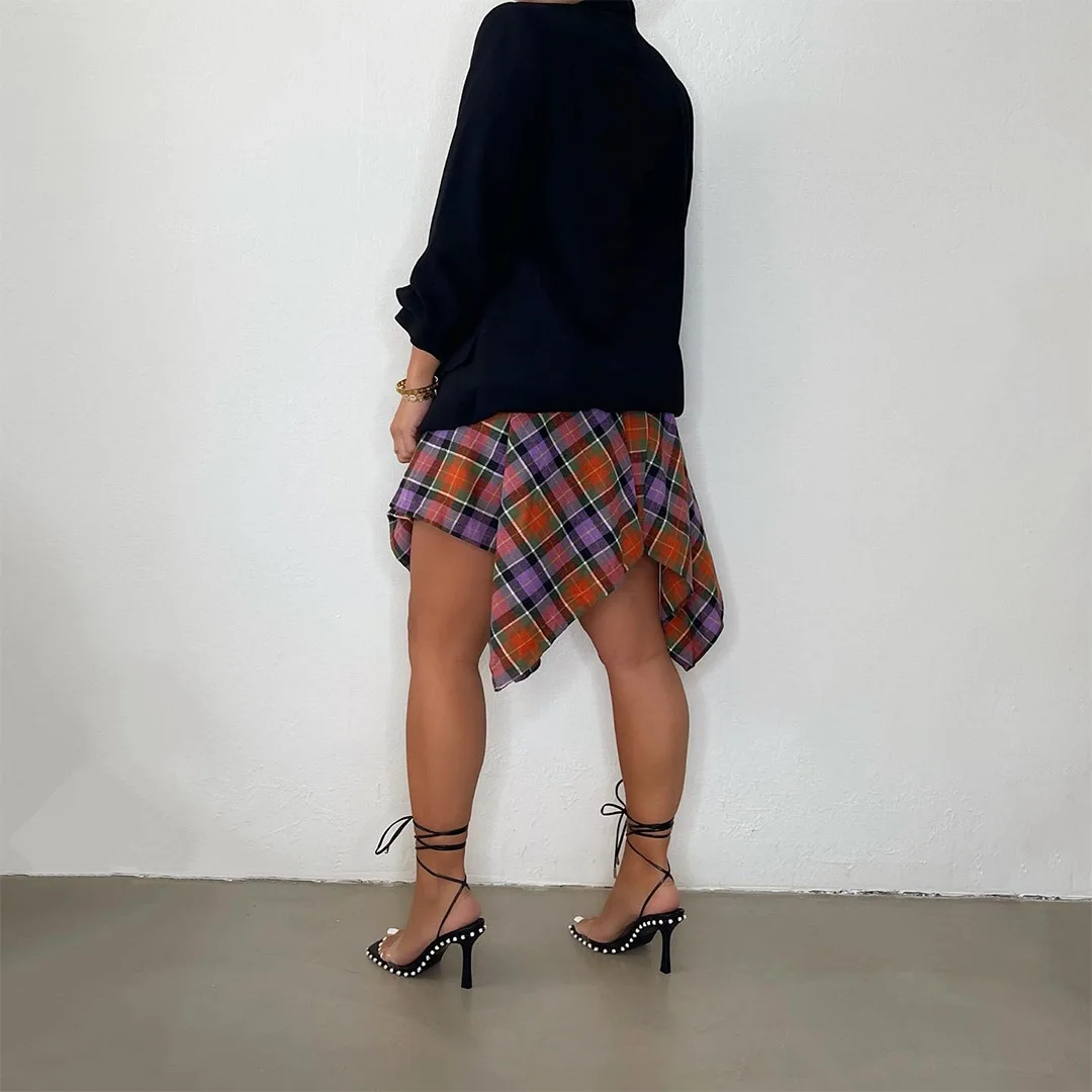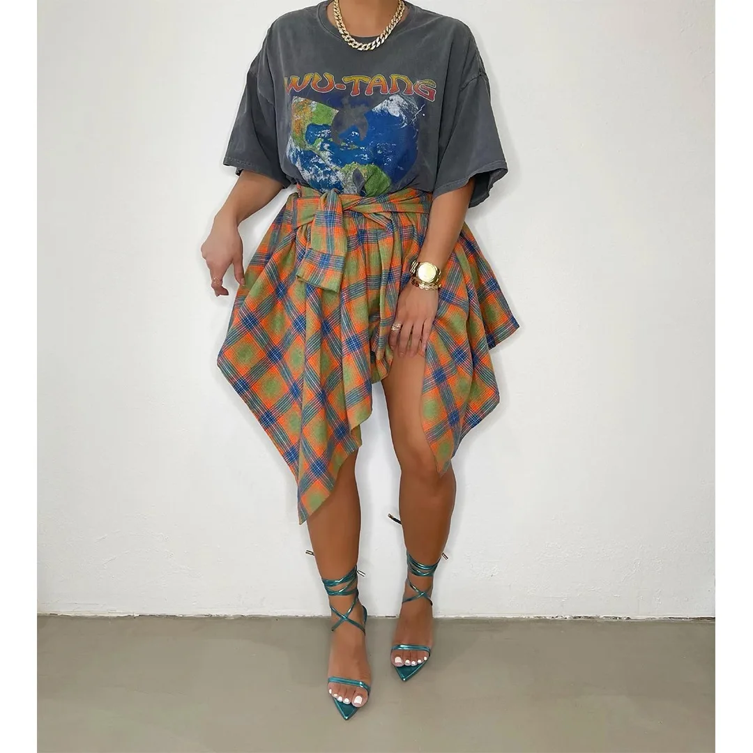 Plaid Checkered Tie Dye Patchwork Pleated Skirt Women Vintage High Waist Ruched Maxi Skirt Summer Female Floor Length Skirts