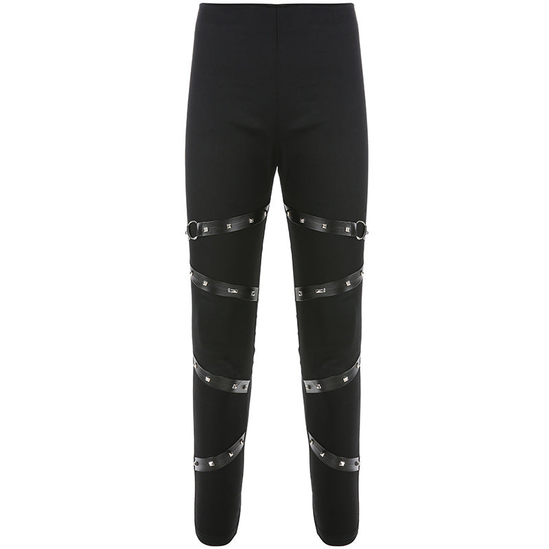 Push Up Black Gothic Leggings Women Ribbon With Rivet Patchwork Leggins Mujer Streetwear High Waist Punk Legging Pants