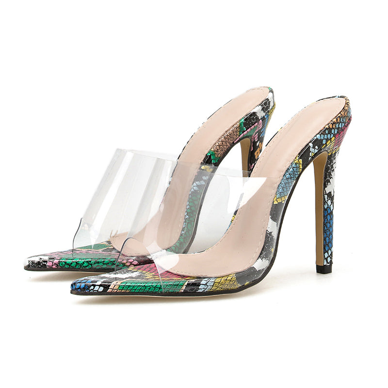 PVC High Heels Pointed Toe Snake Print All Match Sandals And Slippers Women